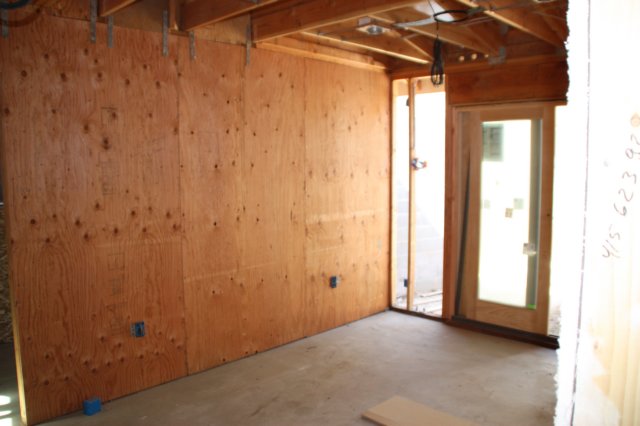 Bookshelf wall (yes, we will be putting bookshelves back) looking towards the bedroom that opend up to the breezeway.